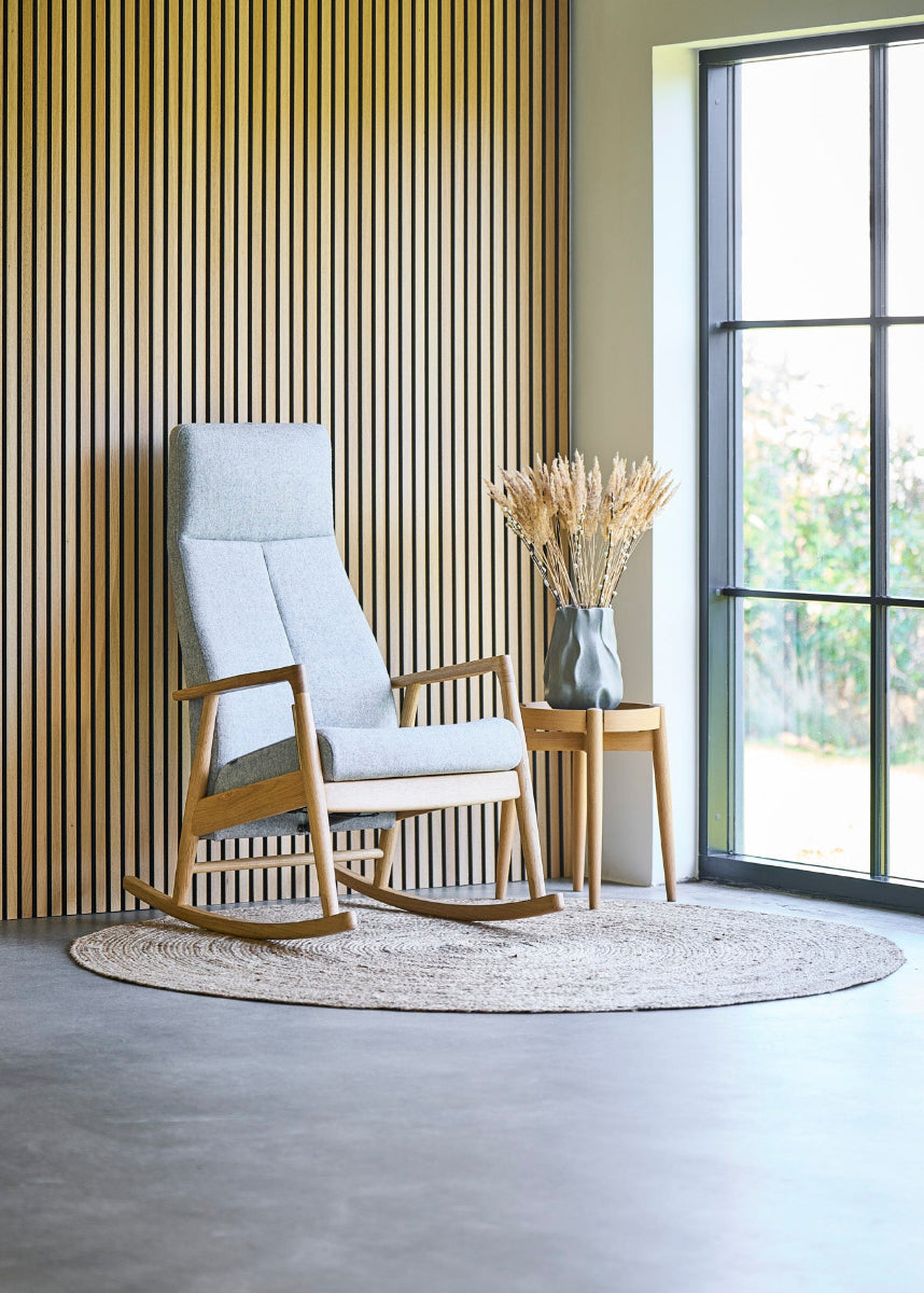 Nobel gyngestolen egner sig særdeles godt sammen med hvilestolene Nobel 8920 og 8900 og kan skabe ro i boligindretningen med matchende møbler.