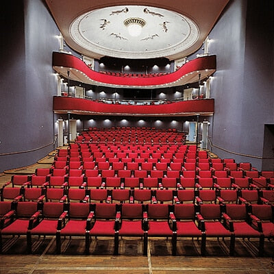 Det store flotte teaterrum på Horsens teater, indrettet med den stabelbare stol Fastoflex 2311. Ses her med polstret armkobling, hvilket gør at rækkerne står mere stabilt og armlænene bliver mere behagelige.