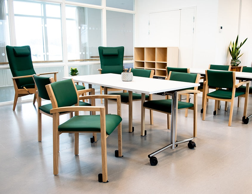 Spiseafdeling er indrettet med Scala 2411 – Scala er en stabelbar stol med høj siddekomfort. 2411 modellen er med armlæn (fås også med gribebøjle – Scala 2419 og uden armlæn – Scala 2410). Til dette plejecenter er den monteret med glidehjul – for nemt at kunne skubbe stolen ind og trække den ud.