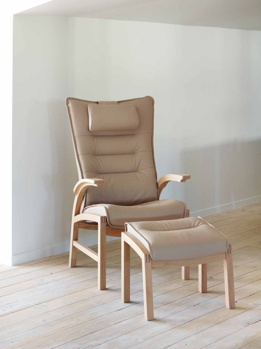 Skamlen har smukke fingretapninger ligesom Cantate lænestolen - og er produceret dygtige håndværkere i Danmark, så kvalitet og komfort er i særklasse.